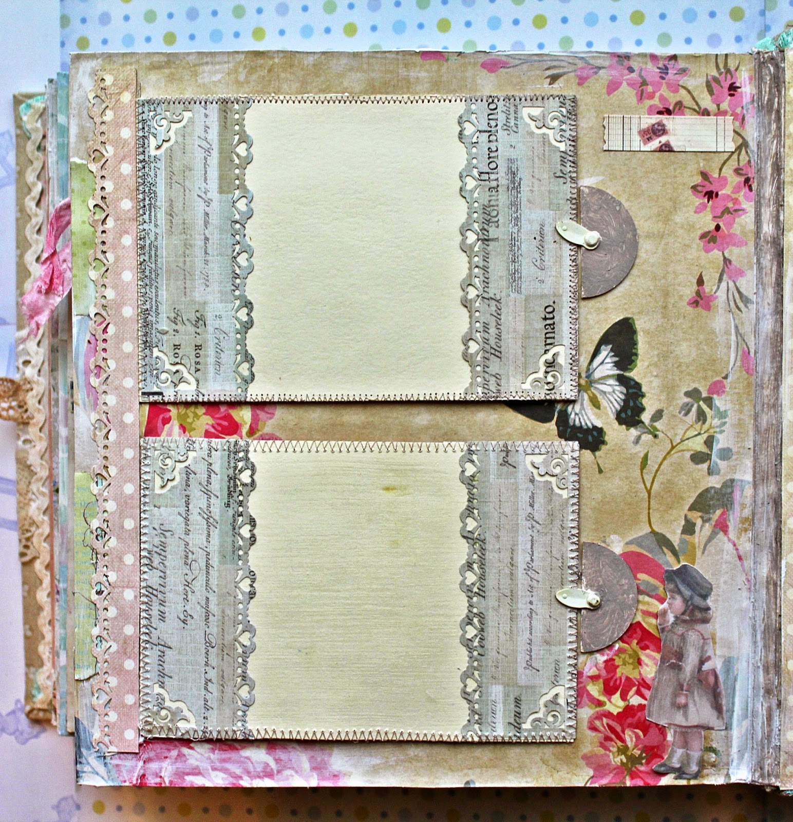 Отдельно напишу про бумагу. В основе Прима, коллекция с феями, эта страничка полностью из нее. Бумага 30 на 30 очень плотная, конверт получился добротным. К сожалению, нет фотографий особенности его крепления, он приподнят гармошкой, чтобы поместилось больше снимков. Закрывается на ленту, которую проклеила внизу между двумя лювесами, так она не выпадет.